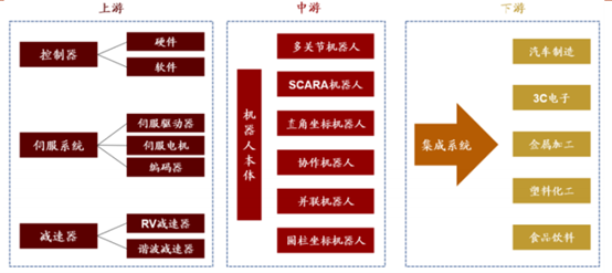 工業機器人的產業鏈上中下游分別為零部件、機器人本體和集成系統。其中控制器、伺服電機、減速器等關鍵部件的核心技術都被國外企業把持著,以控制器為例,海外巨頭長期控制著國內超過80%的市場份額。