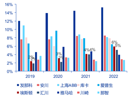 與此同時,國內企業開始從低端市場殺向中高端市場,已經出現埃斯頓、匯川技術、綠的諧波等一批領軍企業。他們在核心零部件具備了和國外品牌硬碰硬的底氣,同時在價格和售后等方面具備明顯優勢。比如埃斯頓和匯川技術的市場份額從2019年的2%提升至2022年的5%左右。