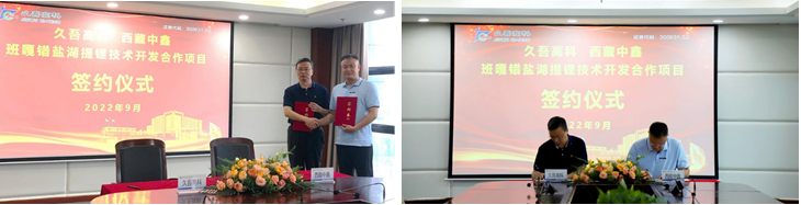 2022年9月15日,久吾高科與西藏中鑫投資有限公司(以下簡稱“西藏中鑫”)舉行“班嘎錯(cuò)鹽湖吸附耦合膜法原鹵提鋰技術(shù)開發(fā)合作項(xiàng)目”簽約儀式。西藏中鑫董事長賈立新、久吾高科董事長黨建兵率經(jīng)營層出席簽約儀式。