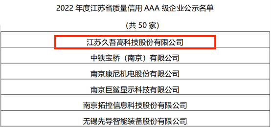 2022年3月21日,江蘇久吾高科技股份有限公司啟動了“2022年度江蘇省質量信用AAA級企業(yè)等級認定”申報工作,旨在圍繞質量信用等級認定工作的各項技術指標,結合公司的管理體系和績效管理模式,重點展現(xiàn)出久吾高科在經(jīng)營管理方面的方法、過程,以及取得的成效。2022年度江蘇省質量信用AAA級企業(yè)等級認定名單發(fā)布,通過的企業(yè)僅有50家,久吾高科順利入圍,并獲此殊榮。