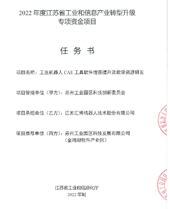近日,匯博機(jī)器人“工業(yè)機(jī)器人CAE工具軟件增強(qiáng)提升及教學(xué)資源研發(fā)”項(xiàng)目獲得“2022年度江蘇省工業(yè)和信息產(chǎn)業(yè)轉(zhuǎn)型升級(jí)專項(xiàng)”支持!