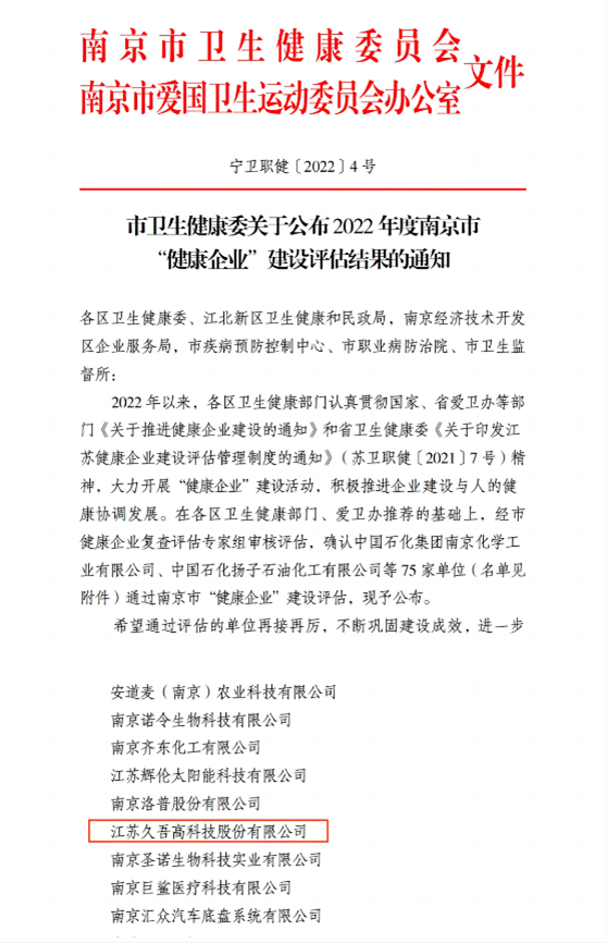 通過檢查,考評專家組對該公司“健康企業(yè)”創(chuàng)建中所做的大量工作給予了充分的肯定,一致認為公司高度重視健康企業(yè)創(chuàng)建工作,將健康理念融入企業(yè)文化,有效提升了員工健康素養(yǎng)和企業(yè)健康管理水平,提高了員工幸福感與滿意度。最終久吾高科順利通過評審,榮獲2022年度南京市“健康企業(yè)”的稱號。