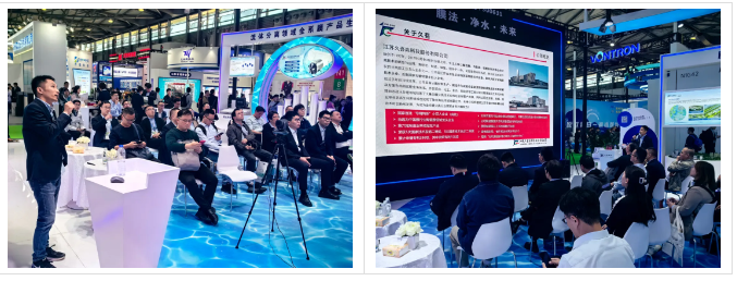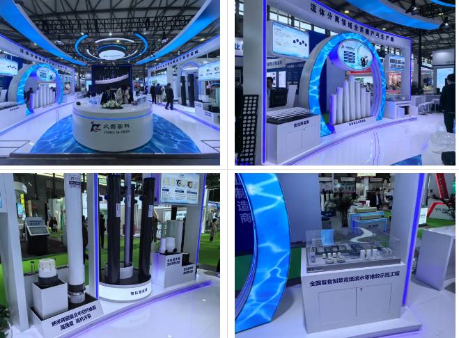 這次環(huán)博會(huì)上,久吾高科展臺兩側(cè)分別放置了公司“拳頭”產(chǎn)品高裝填柱式陶瓷膜和有機(jī)管式膜,并在展品旁邊展示了與產(chǎn)品有關(guān)的成熟案例。展臺中間是洽談區(qū)和交流區(qū),展臺的背景是一塊巨大的LED屏幕,滾動(dòng)播放著公司最新版的宣傳片。