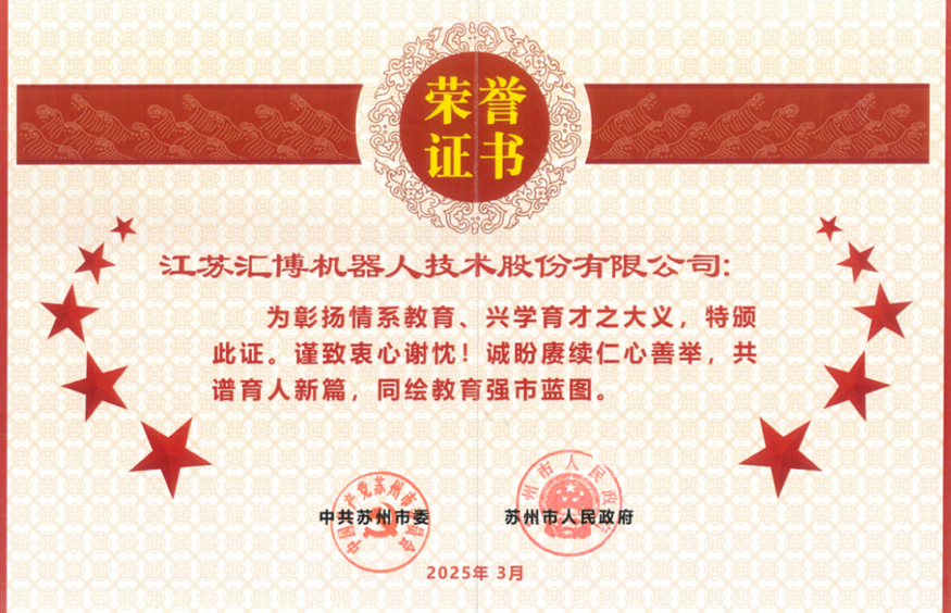 3月16日,蘇州市教育大會召開,為蘇州建設教育強市注入新動力。大會表彰了捐資助學代表,匯博機器人榮獲蘇州市委、市政府頒發的榮譽證書。同期,匯博機器人與蘇州市職業大學校企合作共建一流學科,推動人才鏈與產業鏈深度融合。